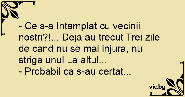- Ce s-a Intamplat cu vecinii nostri?!... Deja au trecut Trei zile de cand nu se mai injura, nu striga unul La altul...