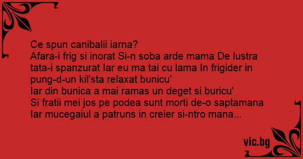 Ce spun canibalii iarna? Afara-i frig si inorat Si-n soba arde mama De lustra tata-i spanzurat Iar eu ma tai cu lama In frigider in pung-d-un kil'sta relaxat bunicu' Iar din bunica a mai ramas un deget si buricu' Si fratii mei jos pe podea sunt morti de-o saptamana Iar mucegaiul a patruns in creier si-ntro mana...