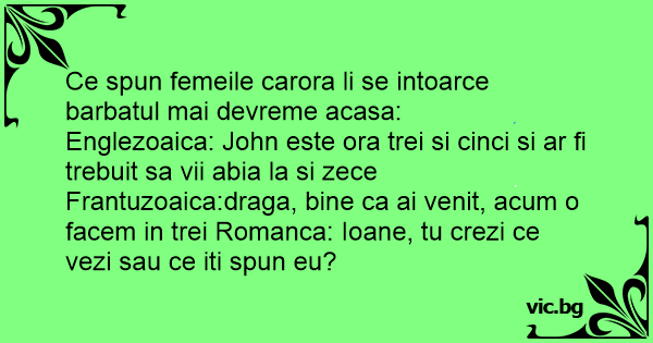Englezoaica: John este ora trei si cinci si ar fi trebuit sa vii abia la si zece Frantuzoaica:draga, bine ca ai venit, acum o facem in trei Romanca: Ioane, tu crezi ce vezi sau ce iti spun eu?