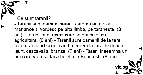 - Taranii sunt oameni saraci, care nu au ce sa manance si vorbesc pe alta limba, pe taraneste. (8 ani) - Taranii sunt aceia care se ocupa si cu agricultura. (8 ani) - Taranii sunt oamenii de la tara care n-au iaurt si noi cand mergem la tara, le ducem iaurt, cascaval si branza. (7 ani) - Tarani inseamna un om care vrea sa faca buletin in Bucuresti. (8 ani)