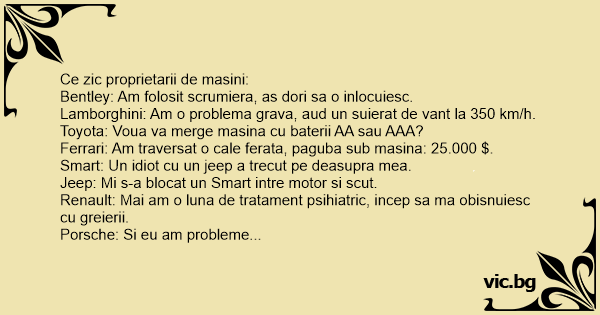 Ce zic proprietarii de masini: Bentley: Am folosit scrumiera, as dori sa o inlocuiesc. Lamborghini: Am o problema grava, aud un suierat de vant la 350 km/h. Toyota: Voua va merge masina cu baterii AA sau AAA? Ferrari: Am traversat o cale ferata, paguba sub masina: 25.000 $. Smart: Un idiот cu un jeep a trecut pe deasupra mea. Jeep: Mi s-a blocat un Smart intre motor si scut. Renault: Mai am o luna de tratament psihiatric, incep sa ma obisnuiesc cu greierii. Porsche: Si eu am probleme cu ceafa. E de la acceleratie. Hummer: Caut service la mai putin de 10 km, pana acolo ma costa mai putin de 50$ drumul. Citroen: Probleme cu comenzile vocale, holograma de la bord si pornirea pe baza de scanare a retinei. BMW: Am scos toba, acum trezesc tot orasul. McLaren: Un penibil cu un F16 a sugerat sa ne intrecem. Land Rover: Intalnire auto maine pe Himalaya. Volvo: Petitie pentru noile теsте NCAP cu 10 stele. Dacia: Am schimbat totul! Pur si simplu nu porneste!