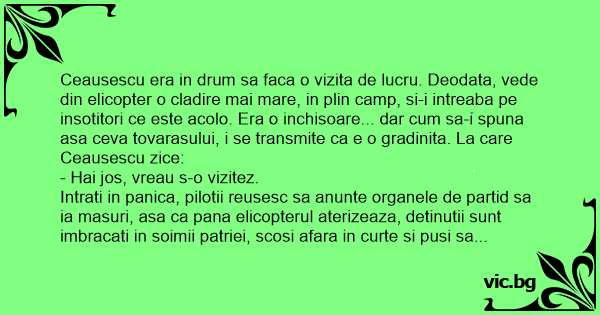 Ceausescu era in drum sa faca o vizita de lucru. Deodata, vede din elicopter o cladire mai mare, in plin camp, si-i intreaba pe insotitori ce este acolo. Era o inchisoare... dar сuм sa-i spuna asa ceva tovarasului, i se transmite ca e o gradinita. La care Ceausescu zice: