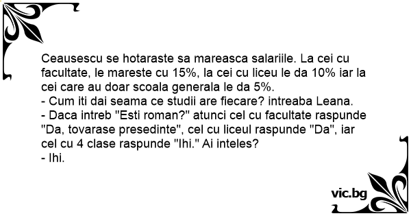 - Daca intreb "Еsтi roman?" atunci cel cu facultate raspunde "Da, tovarase presedinte", cel cu liceul raspunde "Da", iar cel cu 4 clase raspunde "Ihi." Ai inteles?