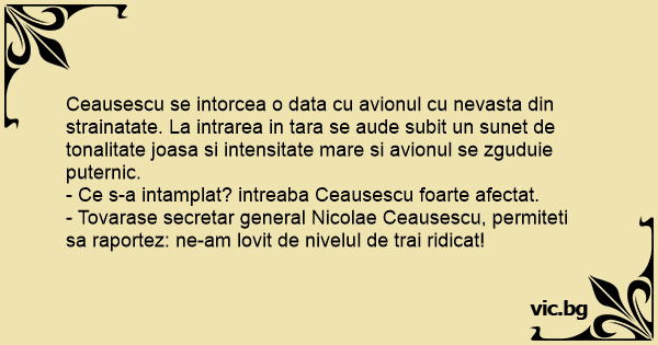 - Tovarase secretar general Nicolae Ceausescu, permiteti sa raportez: ne-am lovit de nivelul de trai ridicat!