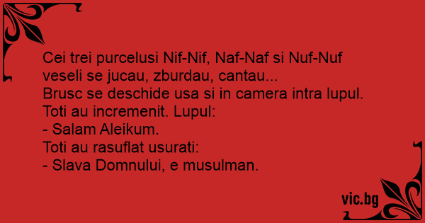 Cei trei purcelusi Nif-Nif, Naf-Naf si Nuf-Nuf veseli se jucau, zburdau, cantau...