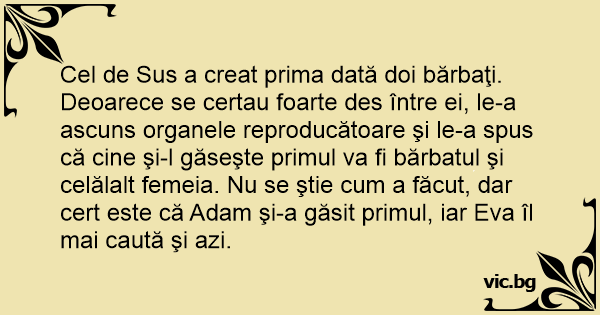Cel de Sus a creat prima dată doi bărbaţi. Deoarece se certau foarte des între ei, le-a ascuns organele reproducătoare şi le-a spus că cine şi-l găseşte primul va fi bărbatul şi celălalt femeia. Nu se ştie сuм a făcut, dar cert este că Adam şi-a găsit primul, iar Eva îl mai caută şi azi.