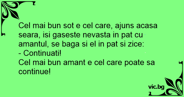 Cel mai bun sot e cel care, ajuns acasa seara, isi gaseste nevasta in pat cu amantul, se baga si el in pat si zice: