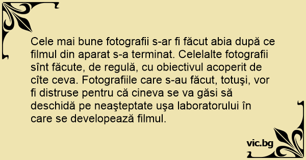 Cele mai bune fotografii s-ar fi făcut abia după ce filmul din aparat s-a terminat. Celelalte fotografii sînt făcute, de regulă, cu obiectivul acoperit de cîte ceva. Fotografiile care s-au făcut, totuşi, vor fi distruse pentru că cineva se va găsi să deschidă pe neaşteptate uşa laboratorului în care se developează filmul.