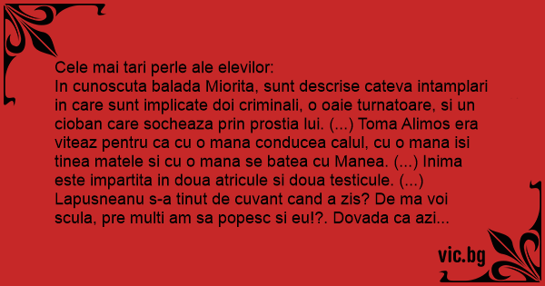 In cunoscuta balada Miorita, sunt descrise cateva intamplari in care sunt implicate doi criminali, o oaie turnatoare, si un cioban care socheaza prin prostia lui. (...) Toma Alimos era viteaz pentru ca cu o mana conducea calul, cu o mana isi tinea matele si cu o mana se batea cu Manea. (...) Inima este impartita in doua atricule si doua testicule. (...) Lapusneanu s-a tinut de cuvant cand a zis? De ma voi scula, pre multi am sa popesc si eu!?. Dovada ca azi cel mai intalnit nume este Popescu. (...) Zoe si Tipatescu se iubeau pe la spate. (...) Ion Creanga s-a nascut intre anii 1887-1889.(...) Imparatul avea o gradina si in fund un mar. (...) Moromete facea partie pe salcam ca sa se dea cu sania. (...) Eminescu este trist pentru ca nu a reusit sa faca nimic in viata