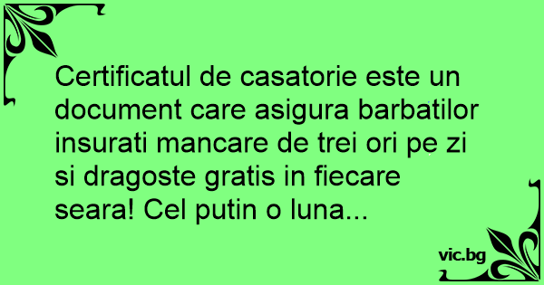 Certificatul de casatorie este un document care asigura barbatilor insurati mancare de trei ori pe zi si dragoste gratis in fiecare seara! Cel putin o luna...