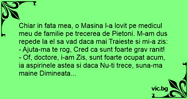 - Of, doctore, i-am Zis, sunt foarte ocupat acum, ia aspirinele astea si daca Nu-ti trece, suna-ma maine Dimineata...