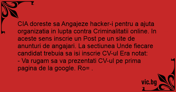 CIA doreste sa Angajeze hacker-i pentru a ajuta organizatia in lupta contra Criminalitatii online. In aceste sens inscrie un Post pe un site de anunturi de angajari. La sectiunea Unde fiecare candidat trebuia sa isi inscrie CV-ul Era notat: