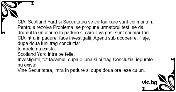 CIA, Scotland Yard si Securitatea se certau care sunt cei mai tari. Pentru a rezolva Problema, se propune urmatorul test: se da drumul la un iepure In padure si care il va gasi sunt cei mai Tari.