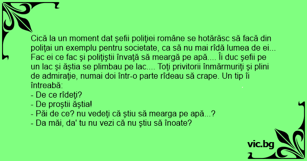 Cică la un moment dat şefii poliţiei române se hotărăsc să facă din poliţai un exemplu pentru societate, ca să nu mai rîdă lumea de ei... Fac ei ce fac şi poliţiştii învaţă să meargă pe apă.... Îi duc şefii pe un lac şi ăştia se plimbau pe lac.... Toţi privitorii înmărmuriţi şi plini de admiraţie, numai doi într-o parte rîdeau să crape. Un tip îi întreabă: