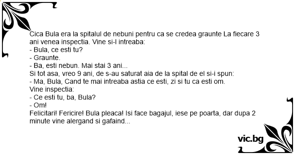 Cica Bula era la spitalul de nebuni pentru ca se credea graunte La fiecare 3 ani venea inspectia. Vine si-l intreaba: