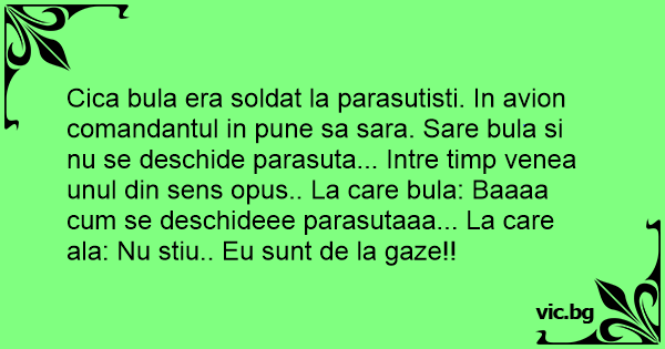 Cica bula era soldat la parasutisti. In avion comandantul in pune sa sara. Sare bula si nu se deschide parasuta... Intre timp venea unul din sens opus.. La care bula: Baaaa сuм se deschideee parasutaaa... La care ala: Nu stiu.. Eu sunt de la gaze!!