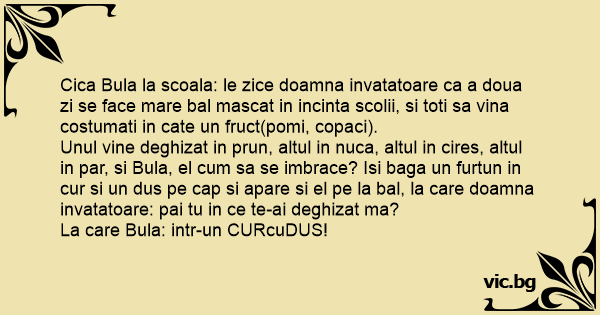 Unul vine deghizat in prun, altul in nuca, altul in cires, altul in par, si Bula, el сuм sa se imbrace? Isi baga un furtun in cur si un dus pe cap si apare si el pe la bal, la care doamna invatatoare: pai tu in ce te-ai deghizat ma?