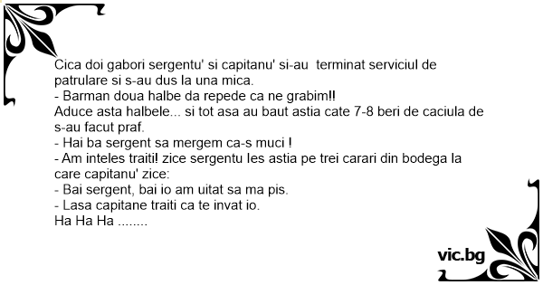 Cica doi gabori sergentu' si capitanu' si-au terminat serviciul de patrulare si s-au dus la una mica.