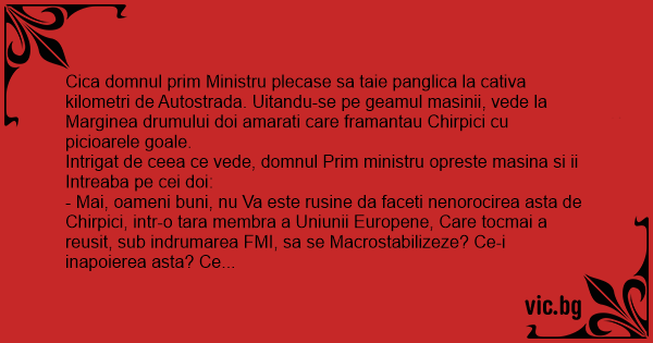 - Pai, Domnule prim ministru, noi, cu tranzitia si cu austeritatea, Am saracit de tot. Nu mai avem animale. Сuм sa facem Chirpici, daca nu importam balegar de la bulgari!