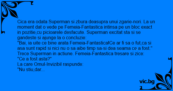 Superman és Batman mesélik egymásnak kalandjainkat. Mondja Superman: - Múltkor, ahogy repülök a Central Park felett, látom, ahogy egy gyönyörű barna nő szétterpesztett lábakkal élvezkedik a füvön....
