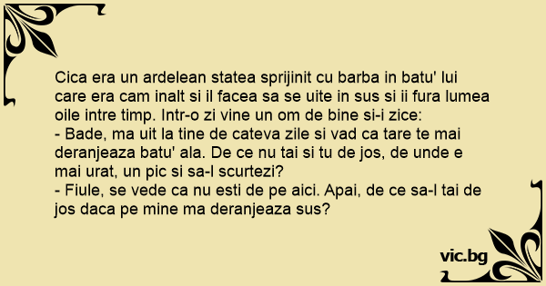Cica era un ardelean statea sprijinit cu barba in batu' lui care era cam inalt si il facea sa se uite in sus si ii fura lumea oile intre timp. Intr-o zi vine un om de bine si-i zice: