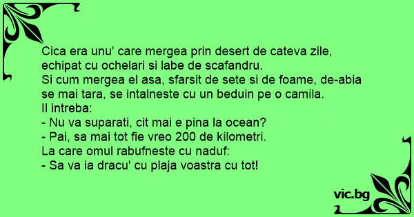 Cica era unu' care mergea prin desert de cateva zile, echipat cu ochelari si labe de scafandru.