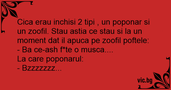 Cica erau inchisi 2 tipi , un poponar si un zoofil. Stau astia ce stau si la un moment dat il apuca pe zoofil poftele: