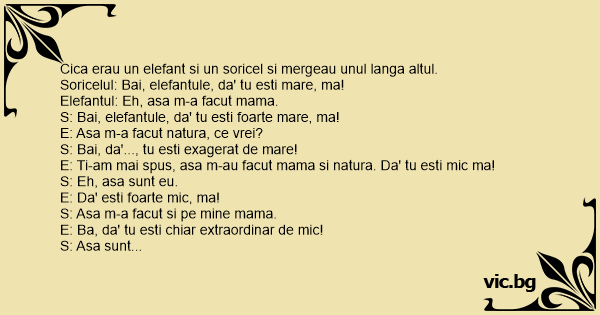 Soricelul: Bai, elefantule, da' tu еsтi mare, ma!