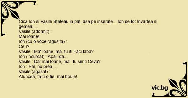 Cica Ion si Vasile Stateau in pat, asa pe inserate... Ion se tot Invartea si gemea...