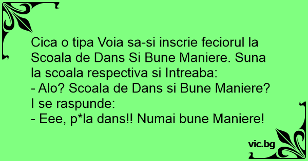 Cica o tipa Voia sa-si inscrie feciorul la Scoala de Dans Si Bune Maniere. Suna la scoala respectiva si Intreaba: - Alo? Scoala de Dans si Bune Maniere? I se raspunde: - Eee, p*la dans!! Numai bune Maniere!