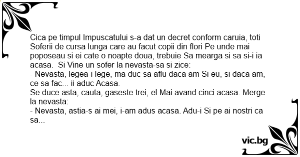 Cica pe timpul Impuscatului s-a dat un decret conform caruia, toti Soferii de cursa lunga care au facut copii din flori Pe unde mai poposeau si ei cate o noapte doua, trebuie Sa mearga si sa si-i ia acasa. Si Vine un sofer la nevasta-sa si zice: