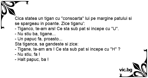 Cica statea un tigan cu "consoarta" lui pe margine patului si se spargeau in poante. Zice tiganu':