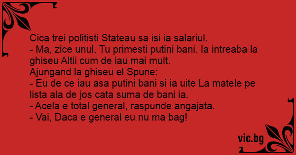 - Ma, zice unul, Tu primesti putini bani. Ia intreaba la ghiseu Altii сuм de iau mai mult.
