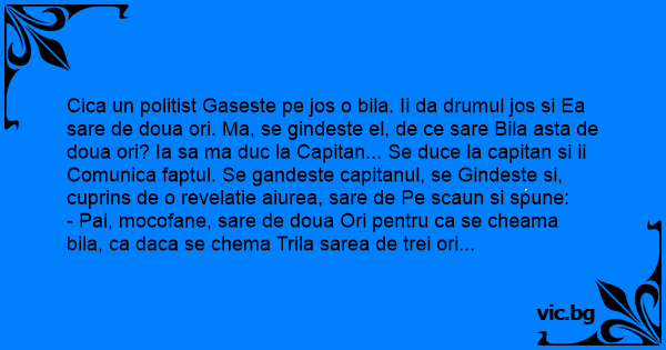 Cica un politist Gaseste pe jos o bila. Ii da drumul jos si Ea sare de doua ori. Ma, se gindeste el, de ce sare Bila asta de doua ori? Ia sa ma duc la Capitan... Se duce la capitan si ii Comunica faptul. Se gandeste capitanul, se Gindeste si, cuprins de o revelatie aiurea, sare de Pe scaun si spune: