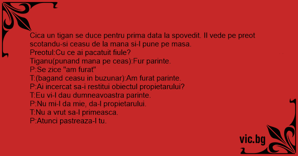 Cica un tigan se duce pentru prima data la spovedit. Il vede pe preot scotandu-si ceasu de la mana si-l pune pe masa.