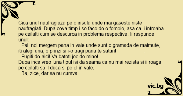 Cica unul naufragiaza pe o insula unde mai gaseste niste naufragiati. Dupa ceva timp i se face de o femeie, asa ca ii intreaba pe ceilalti сuм se descurca in problema respectiva. Ii raspunde unul: