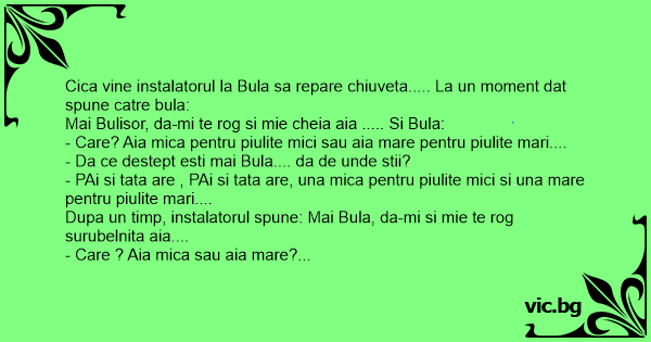 Dupa un timp, instalatorul termina treaba si ramane singur in baie sa faca pipi.... Bulisor al nostru tzup isi arunca ochiul pe gaura cheii, instalatorul iese si ii da cu usa in cap.... La care bula.....