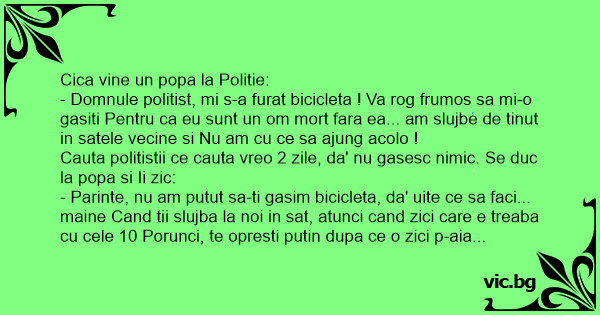 - Parinte, nu am putut sa-ti gasim bicicleta, da' uite ce sa faci... maine Cand tii slujba la noi in sat, atunci cand zici care e treaba cu cele 10 Porunci, te opresti putin dupa ce o zici p-aia cu "Sa nu furi !" si vezi cine Se inroseste la fata. Dupa aia vii si ne spui noua si rezolvam.