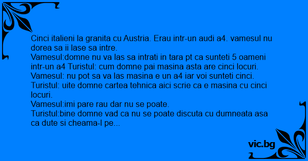 Vamesul:domne nu va las sa intrati in tara pt ca sunteti 5 oameni intr-un a4 Turistul: сuм domne pai masina asta are cinci locuri.