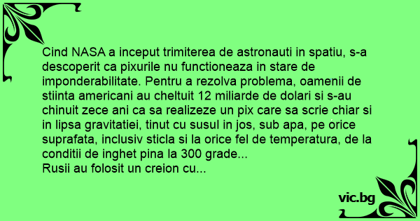 Když NASA poslala první kosmonauty do vesmíru, zjistila, že psací pera nefungují při absenci gravitace. Vyřešením tohoto problému pověřila konzultantskou společnost. Po deseti letech a 12 milionech...