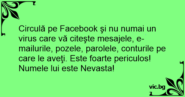 Circulă pe Facebook şi nu numai un virus care vă citeşte mesajele, e-mailurile, pozele, parolele, conturile pe care le aveţi. Este foarte periculos! Numele lui este Nevasta!