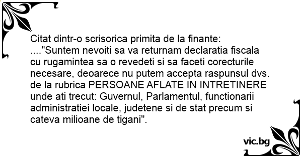 ...."Suntem nevoiti sa va returnam declaratia fiscala cu rugamintea sa o revedeti si sa faceti corecturile necesare, deoarece nu putem accepta raspunsul dvs. de la rubrica PERSOANE AFLATE IN INTRETINERE unde ati trecut: Guvernul, Parlamentul, functionarii administratiei locale, judetene si de stat precum si cateva milioane de tigani".