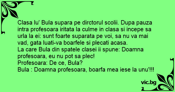 Clasa lu' Bula supara pe dirctorul scolii. Dupa pauza intra profesoara iritata la culme in clasa si incepe sa urla la ei: sunt foarte suparata pe voi, sa nu va mai vad, gata luati-va boarfele si plecati acasa.