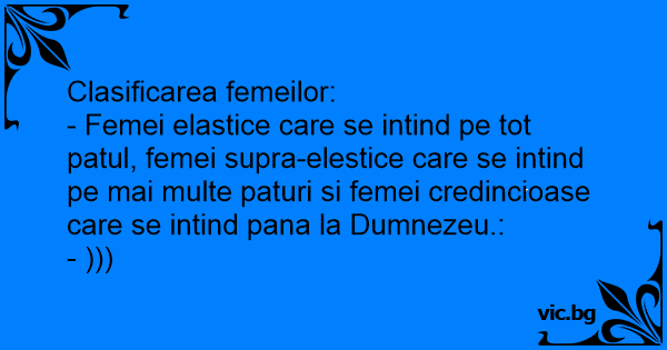 - Femei elastice care se intind pe tot patul, femei supra-elestice care se intind pe mai multe paturi si femei credincioase care se intind pana la Dumnezeu.: