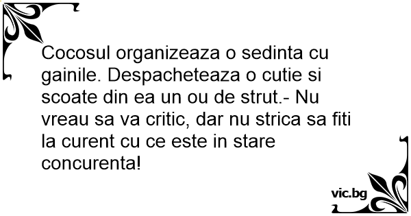 Cocosul organizeaza o sedinta cu gainile. Despacheteaza o cutie si scoate din ea un ou de strut.- Nu vreau sa va critic, dar nu strica sa fiti la curent cu ce este in stare concurenta!