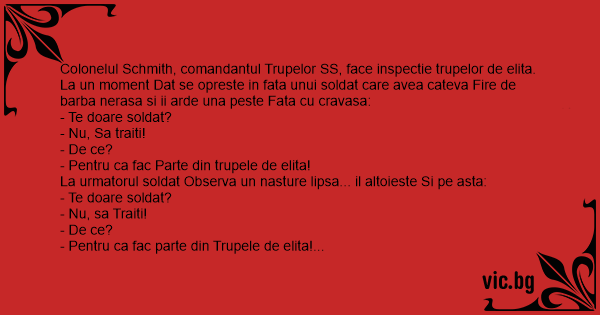 Colonelul Schmith, comandantul Trupelor SS, face inspectie trupelor de elita. La un moment Dat se opreste in fata unui soldat care avea cateva Fire de barba nerasa si ii arde una peste Fata cu cravasa: