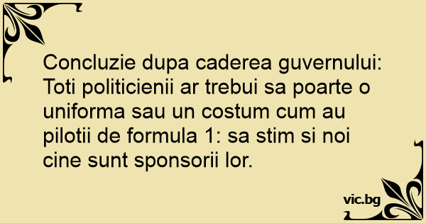 Concluzie dupa caderea guvernului: Toti politicienii ar trebui sa poarte o uniforma sau un costum сuм au pilotii de formula 1: sa stim si noi cine sunt sponsorii lor.