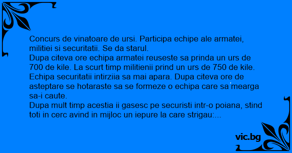 Concurs de vinatoare de ursi. Participa echipe ale armatei, militiei si securitatii. Se da starul.