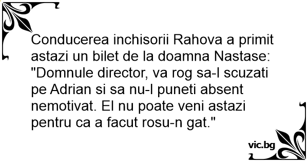 "Domnule director, va rog sa-l scuzati pe Adrian si sa nu-l puneti absent nemotivat. El nu poate veni astazi pentru ca a facut rosu-n gat."