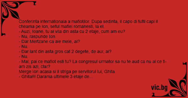 - Ghita!!! Darama ultimele 3 etaje de la casa, vinde elicopterele si cumpara Mertzane, iar cainele du-l in casa, ca lantul lui trebuie sa-l port eu...